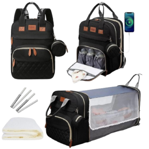 • Professional Diaper Changing Station: This diaper bag goes beyond being a simple backpack. It offers you a secure and sanitary area, enabling diaper changes whenever necessary or providing a comfortable spot for your baby to rest. If your little one needs a nap while you’re out and about, the plush mattress and pillow ensure a cozy and secure environment, complete with a sunshade to shield their eyes.
